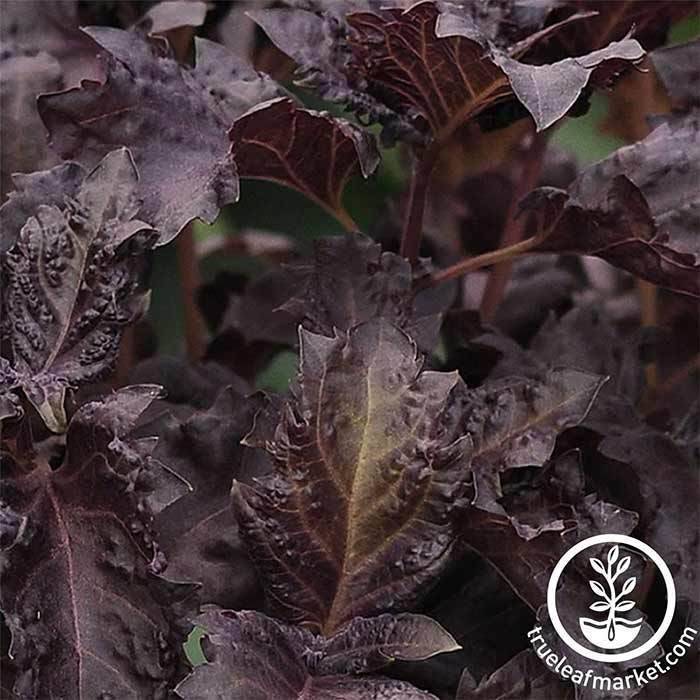 Up to 90 days. AAS Winner. Ornamental and culinary basil with a hint of licorice flavor. A stronger smell and taste than that of Sweet Basil. Large, glossy, dark purple leaves with ruffled and fringed edges, roughly 3 inches long.