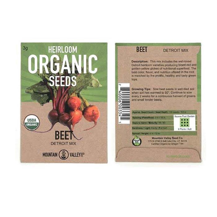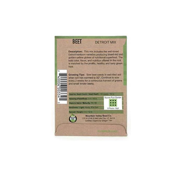 60 days. Heirloom, Non-GMO. Certified Organic. This mix of Detroit Red and Golden Beet seeds will make for a colorful and tasty harvest with all the warm shades of summer. This is a packaged mix of seeds for both red and golden Detroit Beet gardening seeds. This mix can work perfectly for a colorful vegetable harvest. The Beets are great for cooking or pickling, and the greens can work well as part of a salad.