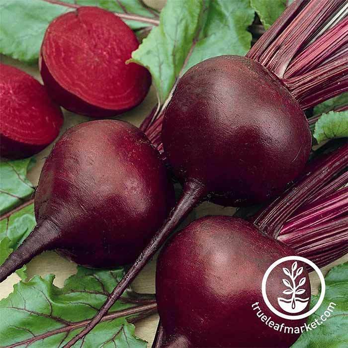 60 days. Certified Organic, heirloom, open-pollinated, Non-GMO. Detroit Dark Red Beet Garden Seeds, known as beetroot and blood turnip, are uniform in shape and flavor. They are known to grow in chilly Spring weather and are mostly problem-free but sometimes get aphids or flea beetles. Control with insecticidal soap, pyrethrins, and good garden sanitation. Leaves grow 8-12” tall. Beets grow to be around 3” wide. After harvest, they can be bottled or pickled, and they are perfect for canning. They can be cut up, blanched, and frozen in freezer bags. Leaves can be picked for tasty greens. Plants are heat and cold tolerant.
