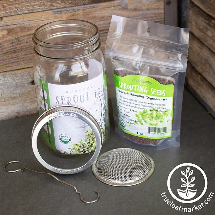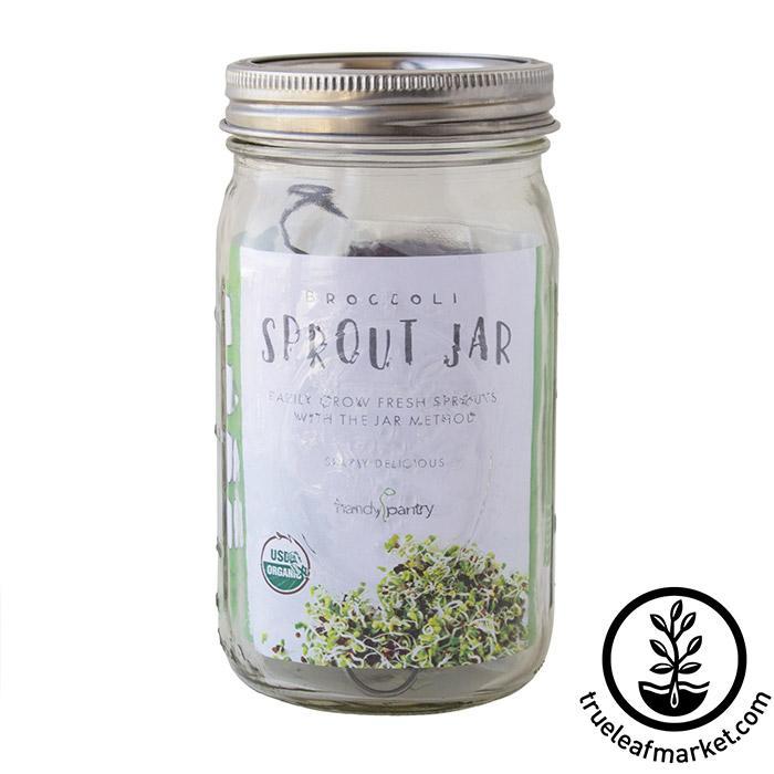 Quart Jar Broccoli Sprouting Kit by Handy Pantry. Includes quart sized glass mason jar, stainless steel sprouting lid with strainer screen and 4 Oz. of certified organic broccoli sprouting seeds.