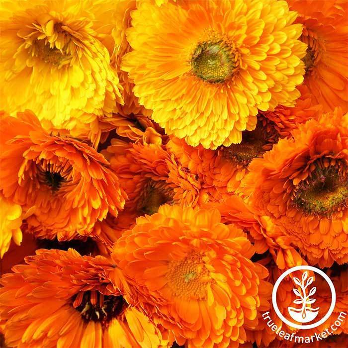 Pacific Beauty Mix calendula seeds have a wildflower-like hardiness and are most commonly broadcasted directly just before the final frost. Blend For earliest spring blooming, begin calendula seeds indoors 6 – 8 weeks prior, seeds will germinate in 7 – 14 days in complete darkness. If transplanting outdoors, harden off to a partially shaded spot. Plants may reseed in the garden in optimal growing conditions. Lightly press 3 – 4 Pacific Beauty Mix seeds 18" apart in average, moderately fertile, and well-drained soil in full sun to partial shade. Calendula has wildflower-like hardiness and are popularly broadcasted directly. Pacific Beauty Mix seeds are more tolerant of heat than other varieties of calendula. Plants will benefit from partial shade in the long summer months and should be properly ventilated and not overwatered, as plants are susceptible to powdery mildew. Calendula has no serious pests, but monitor regularly for slugs on outdoor grows and white aphids on indoor plants. Pacific Mix calendula seeds mature in 98 – 105 days as 15 – 18" tall bushy mounds with a 18 – 24” spread of enormous 3 – 4" golden orange marigold-like blooms.