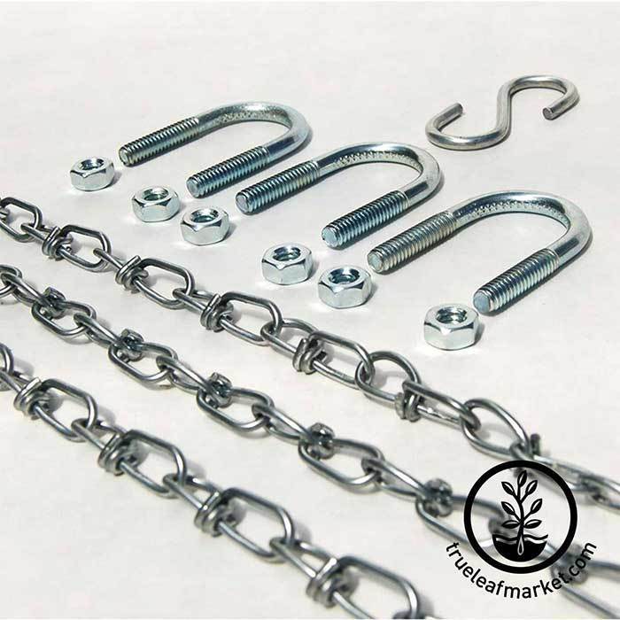 This heavy duty chain kit includes three 18" double-loop chains, three U-bolts, six nuts, one S-hook.