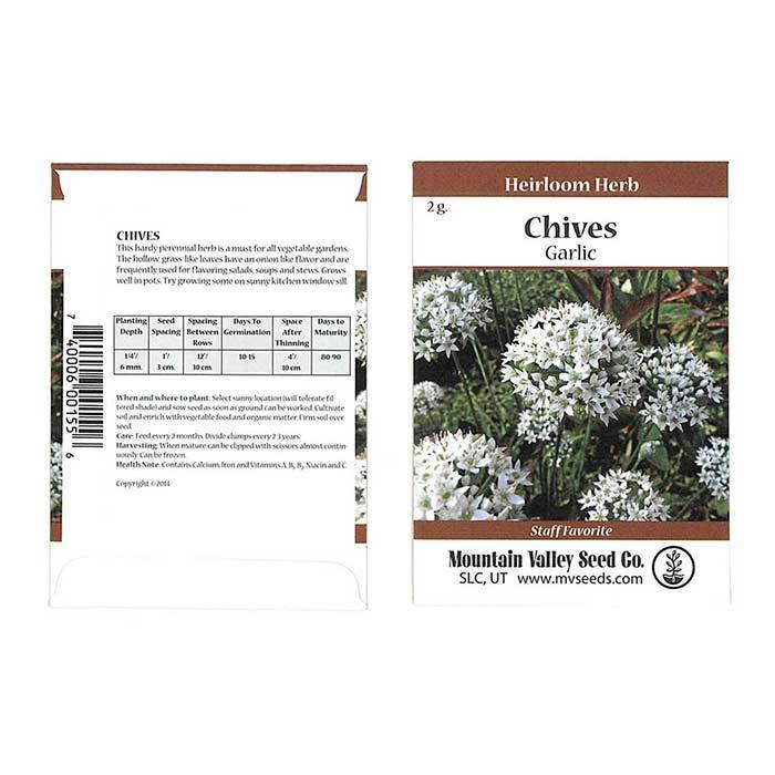 Chives take up to 85 days to grow to maturity. This herb resembles regular chives, but leaves are flat. Mild garlic flavor. Delicious in sauces and soups. Attractive umbels of delicate white flowers.