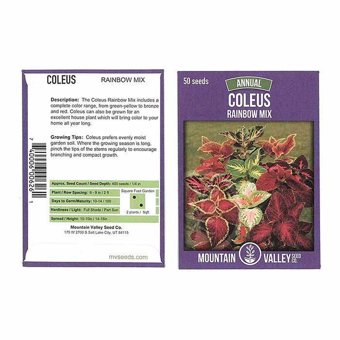 - Diseases/Pests/Troubleshooting: Rainbow Mix seeds will benefit from shade in long summers and direct heat. Do not let soil dry out, but do not over-saturate plants either. Coleus has no serious pests or insects, but monitor regularly for aphids and white flies, particularly on indoor plants.