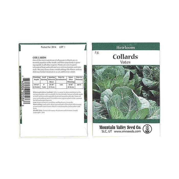 The Vates variety of Collards is a crop that is high in calcium and resistant to light frost. The Vates is an annual crop and reaches maturity seventy to eighty days after being planted. The seeds are slow bolting and produce non-heading leaves and have a mild, cabbage-like flavor, that can be sweetened if exposed to a light frosting while growing.