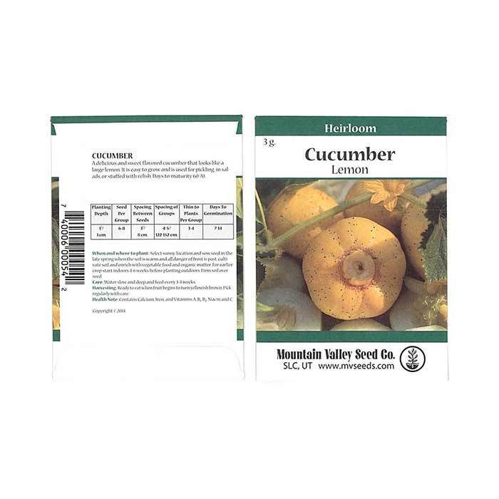 Lemon Cucumbers have a mild, sweet flavor. Use for slicing and pickling. Easy to grow. Pick when young. Lemon cucumber seeds need full sun and should be planted in warm soil with a pH level between 6 and 6.8. Sow the seeds an inch deep with 36 inches between plants. If you are using a trellis, a foot between plants is adequate. Cucumbers will need regular watering while growing. When ready to harvest, cut the Lemon cucumbers at the stem.