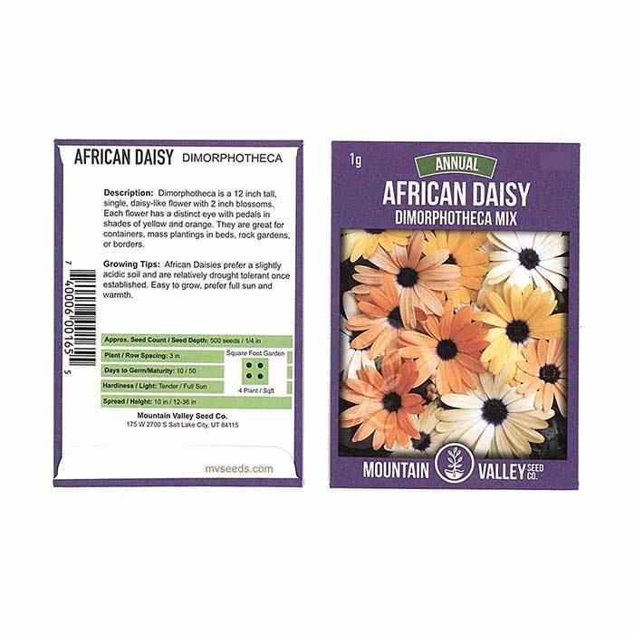 70 – 77 days. Mixed Colors dimorphotheca seeds promise a stunning and exotic African twist to the more traditional daisy cultivated in the United States. Mixed Colors seeds grow tidy 12 – 14” tall mounding African Daisies covered in radiant 2” tangerine, canary, and apricot shaded blooms. Dimorphotheca seeds are native to the demanding arid stretches of southern Africa and Namibia and are perfectly suited for a variety of similarly hot and challenging gardens. Mixed Colors African Daisy seeds boast some of summer's most gorgeous blooms and are a floral shop favorite to accent any seasonal arrangement, basket, or bouquet.