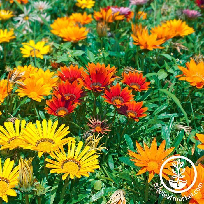New Day Series gazania has a wildflower hardiness and can be sown directly outside after the frost. For earliest blooms, begin seeds indoors 6 – 8 weeks prior. Germination will take 14 – 28 days in full lighting and harden off gazania seedlings in a warm sunny spot in the garden or keep indoors with good drainage and full sun. Lightly press 2 – 3 New Day Series seeds into soil 8” apart in average, medium dry, and well-drained soil in full sun. New Day Series gazania does not perform well in clay or poorly drained soils and can be susceptible to mold and mildew if not drained properly. Gazania is known to be tolerant of drought and dry soils and has no known pests or diseases. New Day Series is a semi-dwarfed variety and should be planted on the south end of the garden to avoid being cast in shade. New Day Series gazania seeds mature in 84 – 91 days as 8 – 10” tall shrubby uprights with a 6 – 8” spread of 3 – 4” daisy-like blooms.