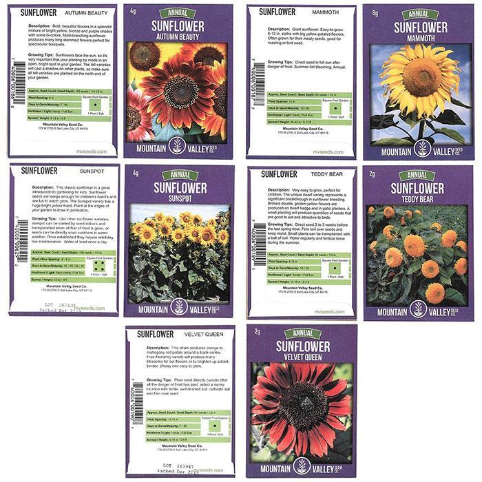 5 Varieties sunflowers are packaged individually by variety, but still follow the same general growing instructions. Sunflowers grow so vigorously that there is little reason to start seeds indoors. Sow 5 Varieties seeds directly after final frost in a sunny spot at the north end of the garden and shelter from strong winds. Young sunflowers may need staking, but will branch into vigorous garden performers. 5 Varieties will take 7 – 21 days for germination. Plant 2 – 3 seeds 1⁄2” deep and 18 – 24” apart in average, loamy, and well-drained soil in full sun. Always plant tall sunflowers at the north end of a garden because it will not take long for it to overshadow a poorly planned garden. Adjust staking and wind protection as 5 Varieties sunflowers mature. Plants are heat and drought tolerant, but susceptible to mold and mildew in poorly-drained soil. Monitor regularly for foliage-eating caterpillars and beetles, but 5 Varieties sunflowers have no serious pests or diseases. 5 Varieties sunflowers will generally all mature within in 90 - 110 days with various mature plants ranging from 24 – 144” tall with an assortment of 8 – 12” heads.