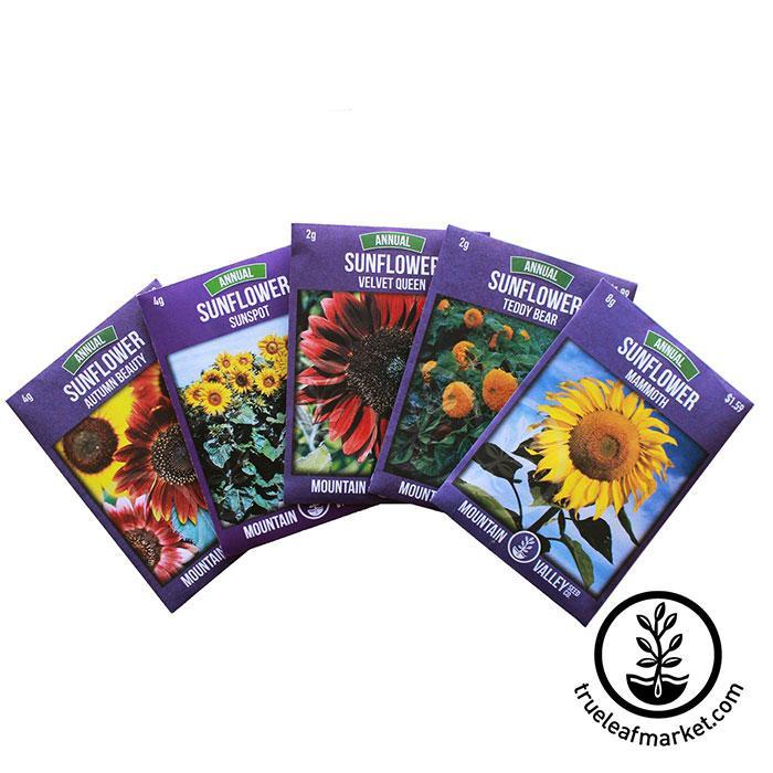 90 - 110 days. Growing 5 Varieties sunflower seeds is the easiest and most economical way to bring bold, vibrant, and diverse pairings of color at a discounted price. 5 Varieties seeds are available for bundle savings with 5 individually packaged varieties of some of the most popular sunflowers including Velvet Queen, Sunspot, Autumn Beauty, Teddy Bear, and Mammoth. 5 Varieties seeds include some of the hardiest and most drought tolerant sunflowers ranging from 2 – 12' tall with brilliant 8 – 12” heads bursting of spectacular color. 5 Varieties seeds are ideal for showcasing varied blooming along the back of a garden, fence, or any wide open spaces all summer long.