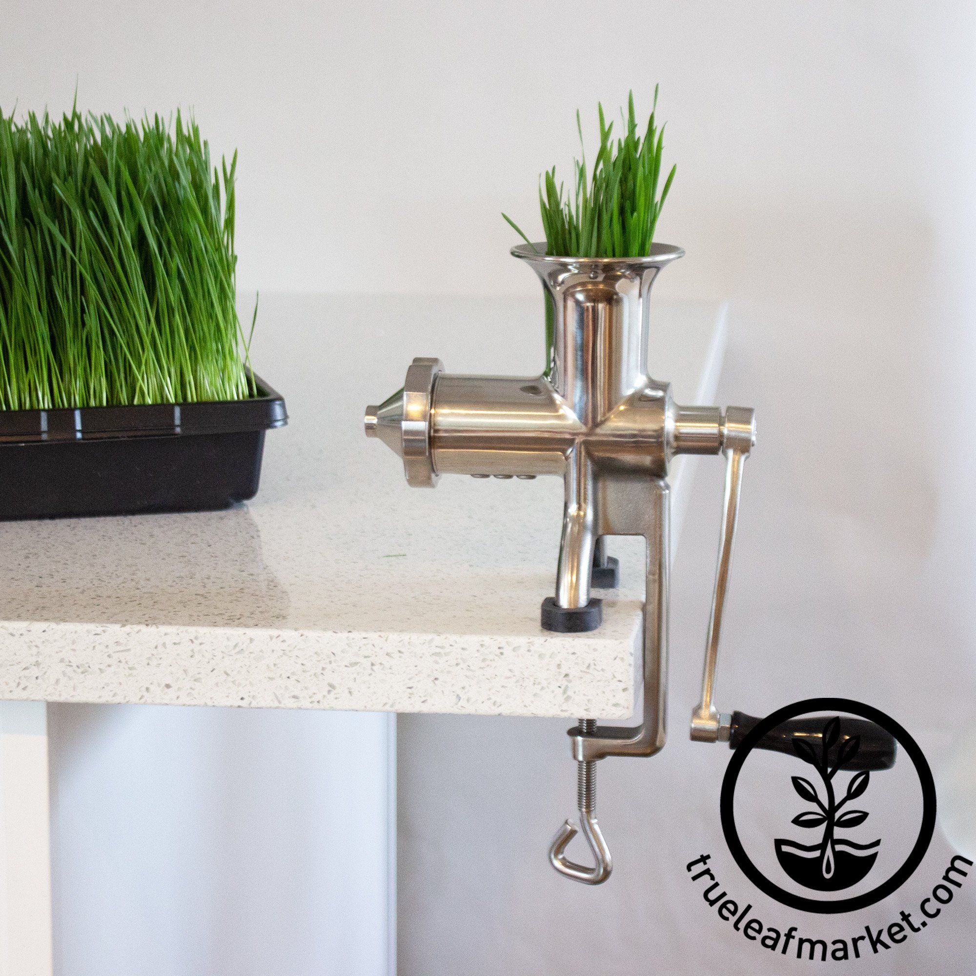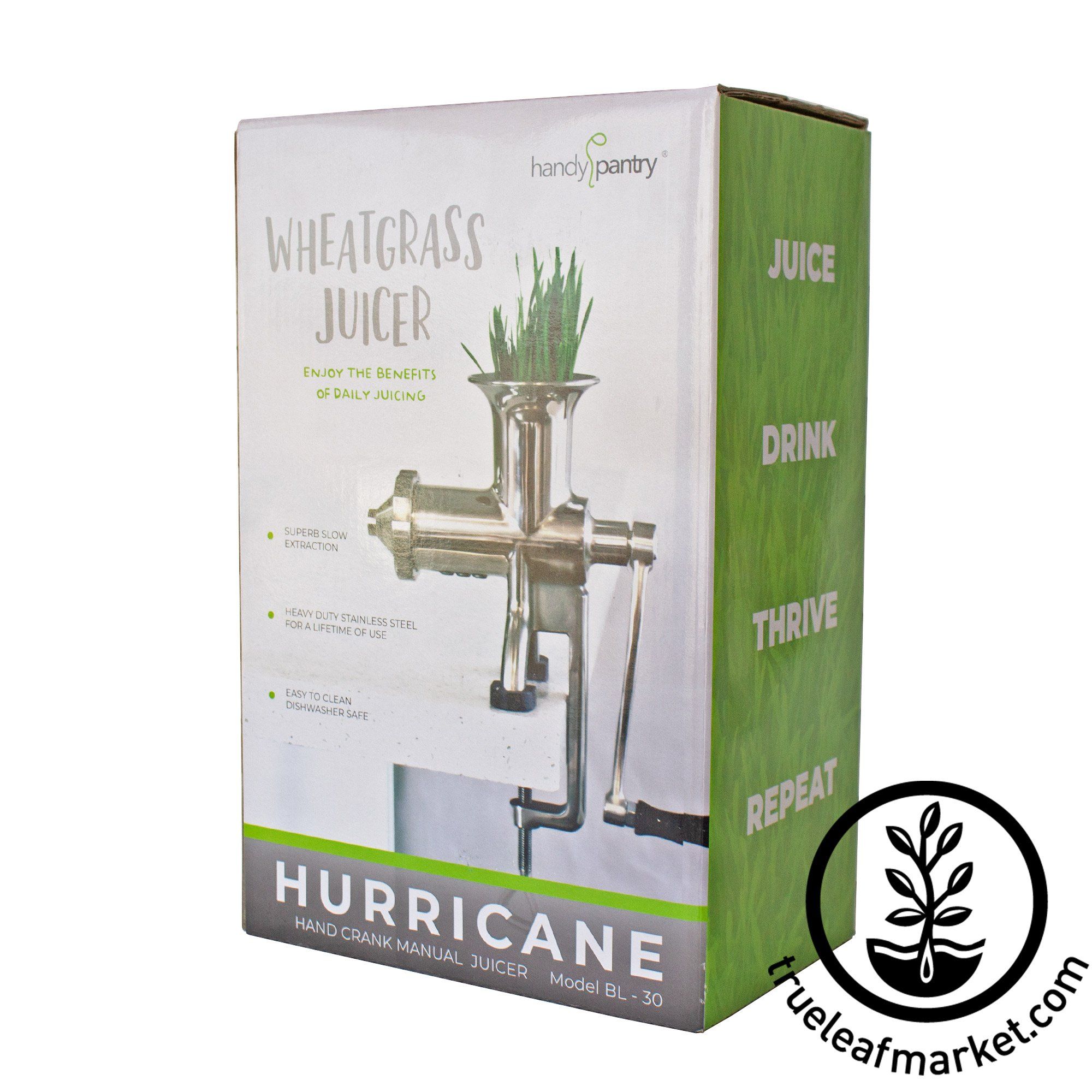 The hurricane wheat grass juicer is our flagship hand crank / manual juicer and hands down the best manual juicer on the planet. The Hurricane Juicer is built to last, because the juicer is stainless steel, it will never rust and it is very easy to clean up and is dishwasher safe. We love the Hurricane because of the efficient juicing design. Once you put a handful of wheat grass or barley grass into the feed spout it almost immediately starts juicing, and the ejected pulp is surprisingly dry. It really gets the juice out. By far or most popular manual juicer.