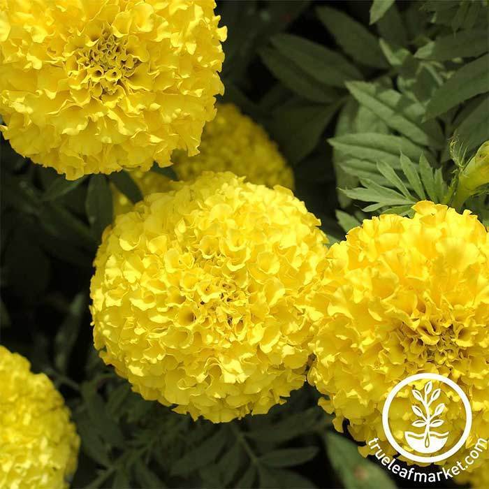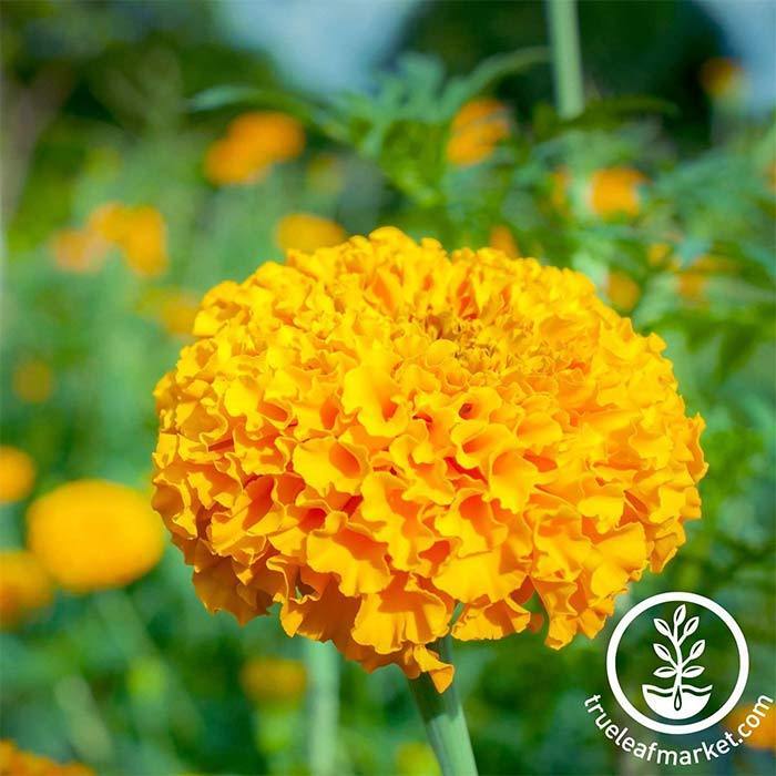 - Growth Habit: 10 – 12” tall bushy mound with a 12” spread of enormous 4” classic fully-double marigold blooms