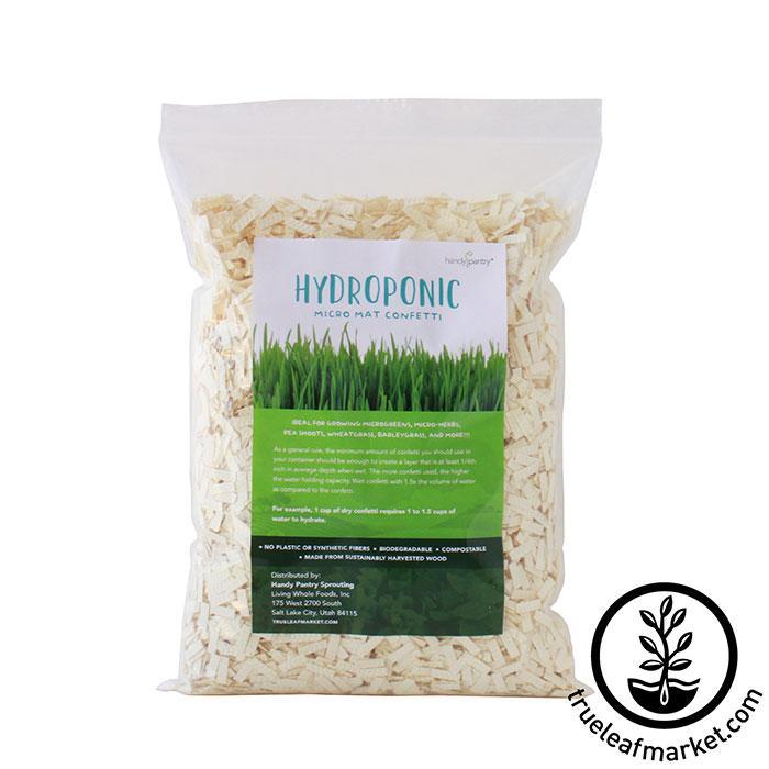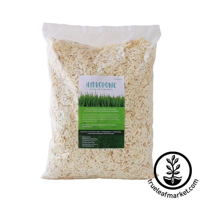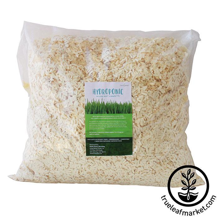 Micro-Mats hydroponic growing confetti is made from biodegradable wood fibers that are highly absorbent and have a very high water holding capacity. The confetti conforms to any container making it the perfect hydroponic grow medium for microgreens and wheatgrass in non-traditional containers. Micro Mat confetti from Handy Pantry are perfect for those looking to grow wheatgrass, barley grass, microgreens, or other plants, without the hassle of dealing with soil.