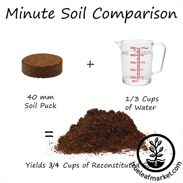 - 40 MM Minute Soil Discs - Bag of 30 - Add 1/3rd cup of water to each disc to re-hydrate - Expands up to 15 times - Yields approx 3/4th cup of soil per disc - Full bag re-hydrates to approx 5.5 quarts of soil.