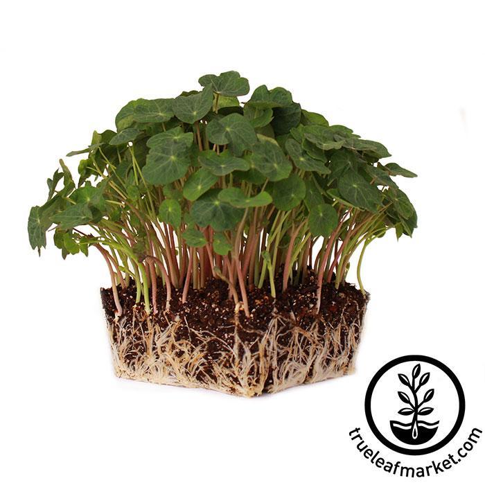Whirlybird Mix Nasturtium microgreens seeds. Edible Flowers. Whirlybird microgreens have medium green leaves with some of the wavy edges rimmed with maroon. The pretty stems are a mix of green and pale pink. Like all Nasturtiums, it has a peppery hot bite, but this one is a bit more complicated with a hint of fruity sweetness at the start.