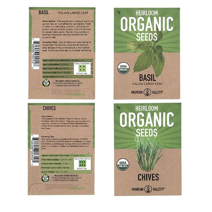 Additionally, this entire collection of 8 varieties of herb seeds are all organic, which means they are non-GMO and no synthetic or chemical pesticides or fertilizers were used throughout the entire growing, harvesting, handling, and packaging process. Planting instructions and individual product descriptions are found on the back of each packet.