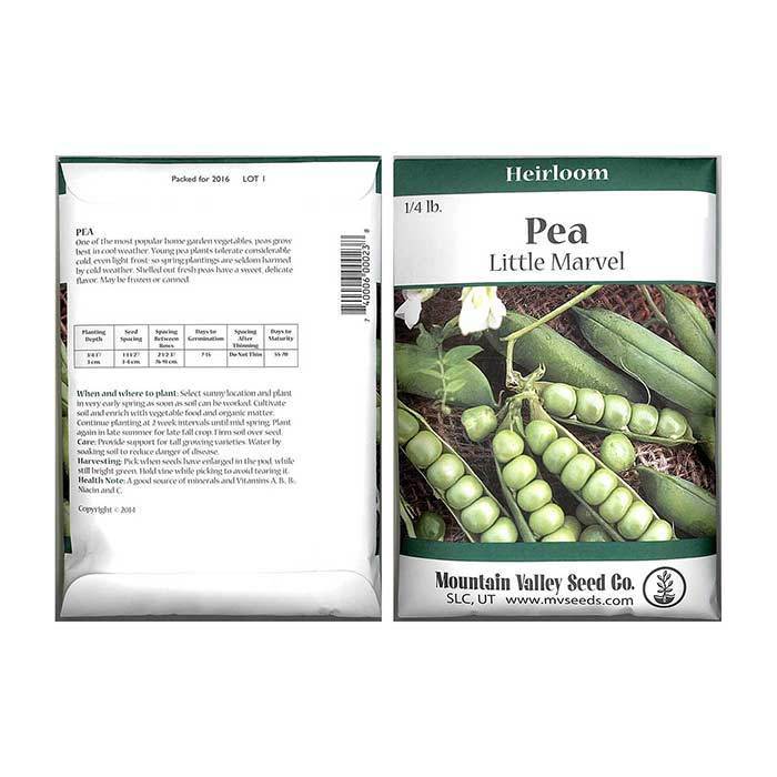 Little Marvel Pea Seeds: 60 days. Pods are 3 inches with 5 or 6 peas. Compact, 18 to 20 inch plant does not require staking. Fine, sweet flavor when picked young. Space saver. Good for freezing. Approx. 90 seeds/oz. Choose Pea Seed Quanity: