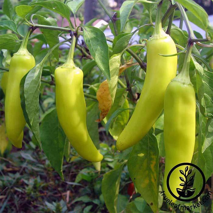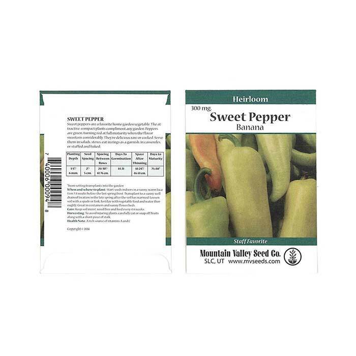 Banana Sweet Pepper Seeds. Non-GMO, Heirloom. 65 days. Sweet and tasty pointed yellow fruit about 7 inches long. Thick walled fruit turn from light yellow to bright red. Popular for salads, frying, and pickling. Approx. 4,450 seeds/oz.