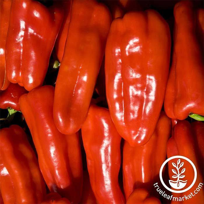 62 days. AAS Winner. Recommended by USU. Huge yields of yellow to orange-red, mostly three-lobed, wedge-shaped fruits on a compact plant. 4 to 5 inch long peppers are always sweet and tasty. Resistant to Tobacco Mosaic Virus. Approx. 4,040 seeds/oz.