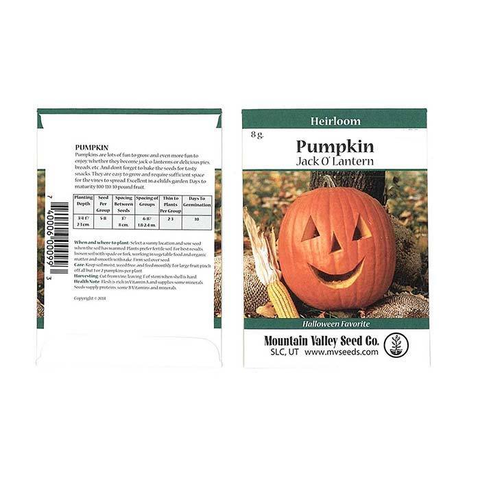 Jack O' Lantern Pumpkin Seeds. Non-GMO, Heirloom. 110 days. 10 pound fruits are thick walled, and smooth skinned, round to slightly oblong. Thick flesh is fine for cooking, but really shines as a carving pumpkin. Approx. 200 seeds/oz.