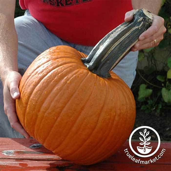 120 Days. Wolf pumpkin produces the most incredible handle you have ever seen. Its 15 to 25 lb. round to oblate shaped fruit has a deep orange color with moderate ribs and very thick, long, firmly attached handles. The flesh thickness is excellent, which helps to prevent flat-sided fruit and makes them deceivingly heavy for their size. Wolf will produce a range of sizes and shapes, but all will have the trademark handle. Note: Improper plant spacing in the field or higher than recommended plant populations can cause reduced fruit set. Final spacing should be at least 6 feet in the row and 12 feet between the rows giving an approximate spacing of 72 square feet per hill or set of two plants. (P.V.P. applied for.)