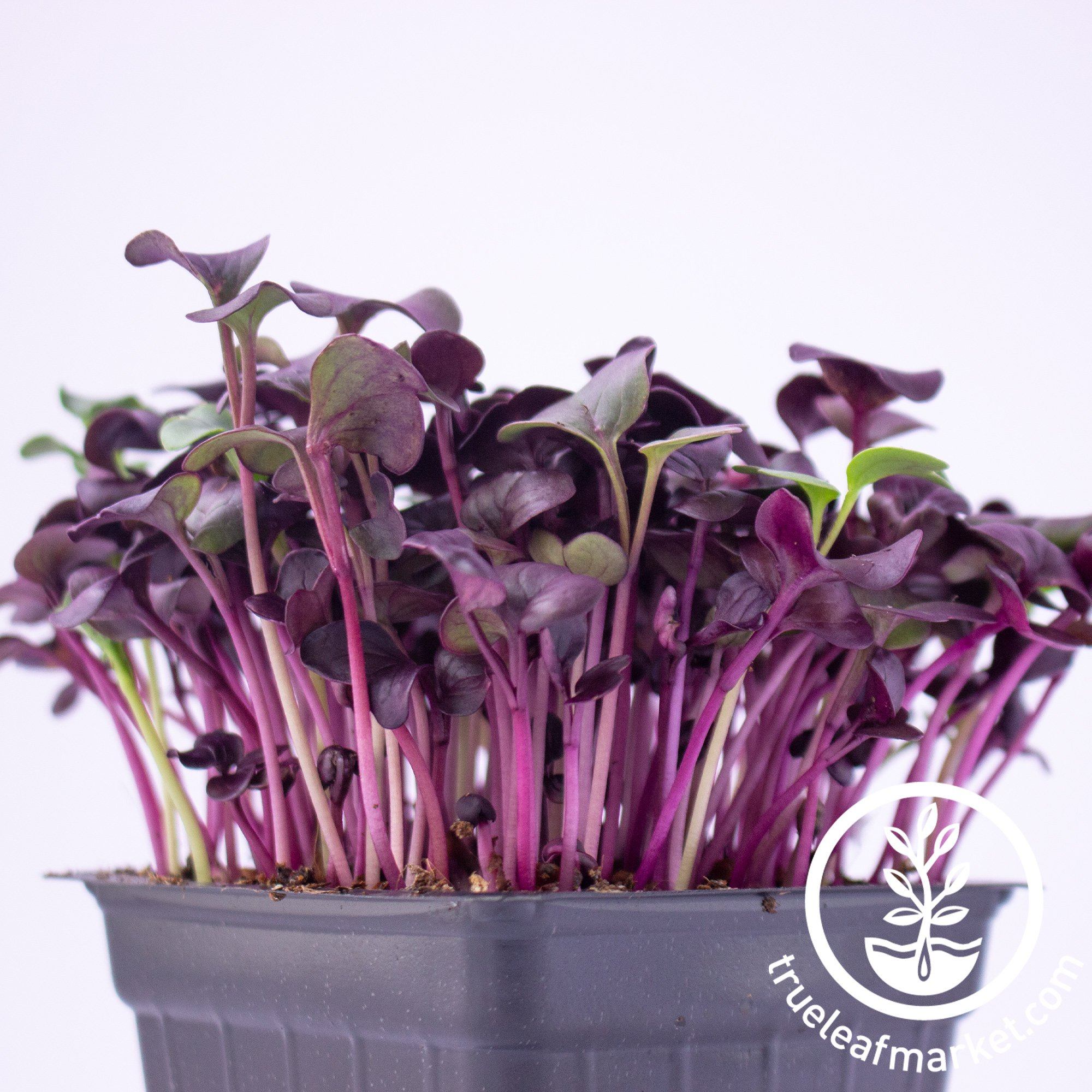 Purple radish is fast and easy to grow. The microgreen is substantial and very crunchy. Due to its fast growth it can be harvested as early as 5 days, assuming you have exposed it to light on day 3. You can flip the lid a day before exposing to light to strengthen the crop.