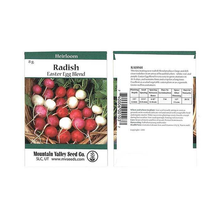 28 days. Recommended by USU. Dependable oval radish in Easter egg hues of pink, red, purple, and white, all with crisp, mild, white flesh. Approx. 2,500 seeds/oz.