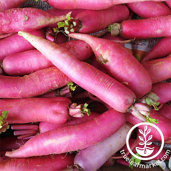 Long Scarlet Cincinnati Radish Seeds. Heirloom, Non-GMO. Raphanus sativus. 30 days. Long tapered deep red roots, 6 x 3/4 in roots, crisp tender white flesh , medium tops, for bunching and home gardens.