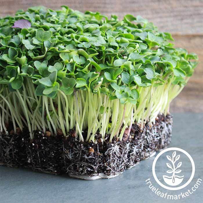 Radish is fast and easy to grow. The microgreen is substantial and very crunchy. Due to its fast growth can be harvested as early as 5 days, assuming you have exposed to light on day 3. These radish microgreens are at their peak of crunchiness at about day 5 or 6. Once they grow larger they get more leafy and lose their crunch. You can flip the lid a day before exposing to light to strengthen the crop.