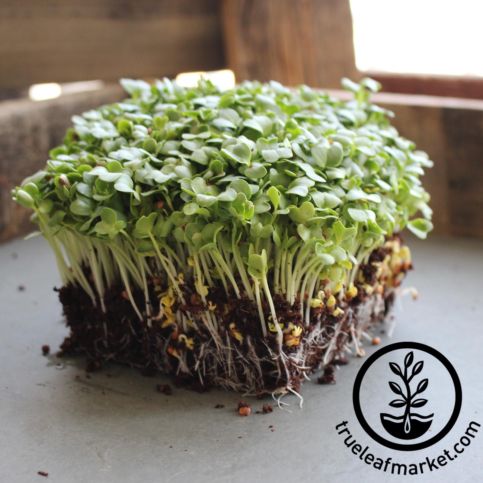 Minowase Radish is an ideal microgreen, often chosen for its stellar color and uniform germination and growth. It is on the spicy side of flavor, but by no means too spicy. Grows well on either hydroponic or soil—hydroponic mediums may require more frequent watering.