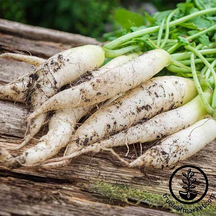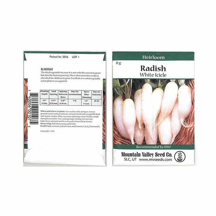 White Icicle Radish Seeds. Non-GMO, Heirloom. 28 days. Recommended by USU. Slender tapered root is 4 to 5 inches long with crisp, mild, white flesh. Approx. 2,500 seeds/oz.