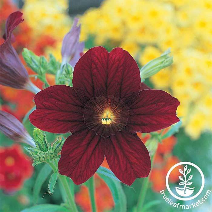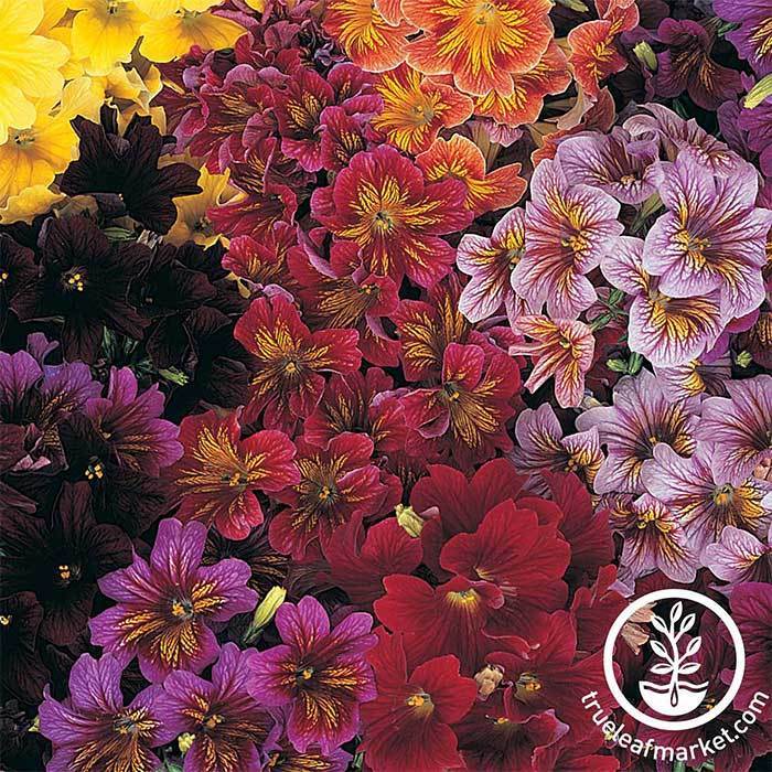 91 – 98 days. Royale Series salpiglossis seeds grow one of summer's most exotic, colorful, and exclusive blooms. Royale Series seeds promise your garden compact salpiglossis bushes bursting with 3” heads of smokey red and mahogany 5-lobed petals. Royale Series salpiglossis seeds only mature to 12 – 16” tall and are an ideal grow as a bedding plant or for indoor containers and pots. Royale Series salpiglossis is native to regions near the Antarctic and is a vigorous performer in cool, temperate gardens. 1000 Seeds.