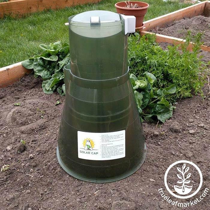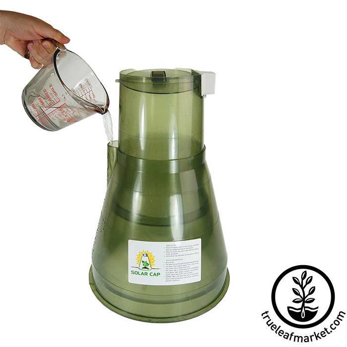 The walls of the solar cap allow light in for chlorophyll production, and a water storage chamber that holds water. The water gathers heat from the sun during the day, and releases it slowly through the cold nights to help keep plants warm. Unlike other devices such as hot caps, domes and water shields, the Solar Cap is the only plant accelerator that has the ability to help sustain safe growing temperatures at night without constant human attention.