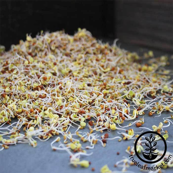This mix with a "kick" was developed for a Grand Canyon hiking trip and was such a hit we have decided to add it to our line, though we did consider selfishly keeping it all to ourselves. This mix contains clover, which is very similar to alfalfa but sheds it hull better, and enough radish and mustard to give the blend a nice "bite back" quality. This mix tastes great on everything, even pancakes - just ask Lance.