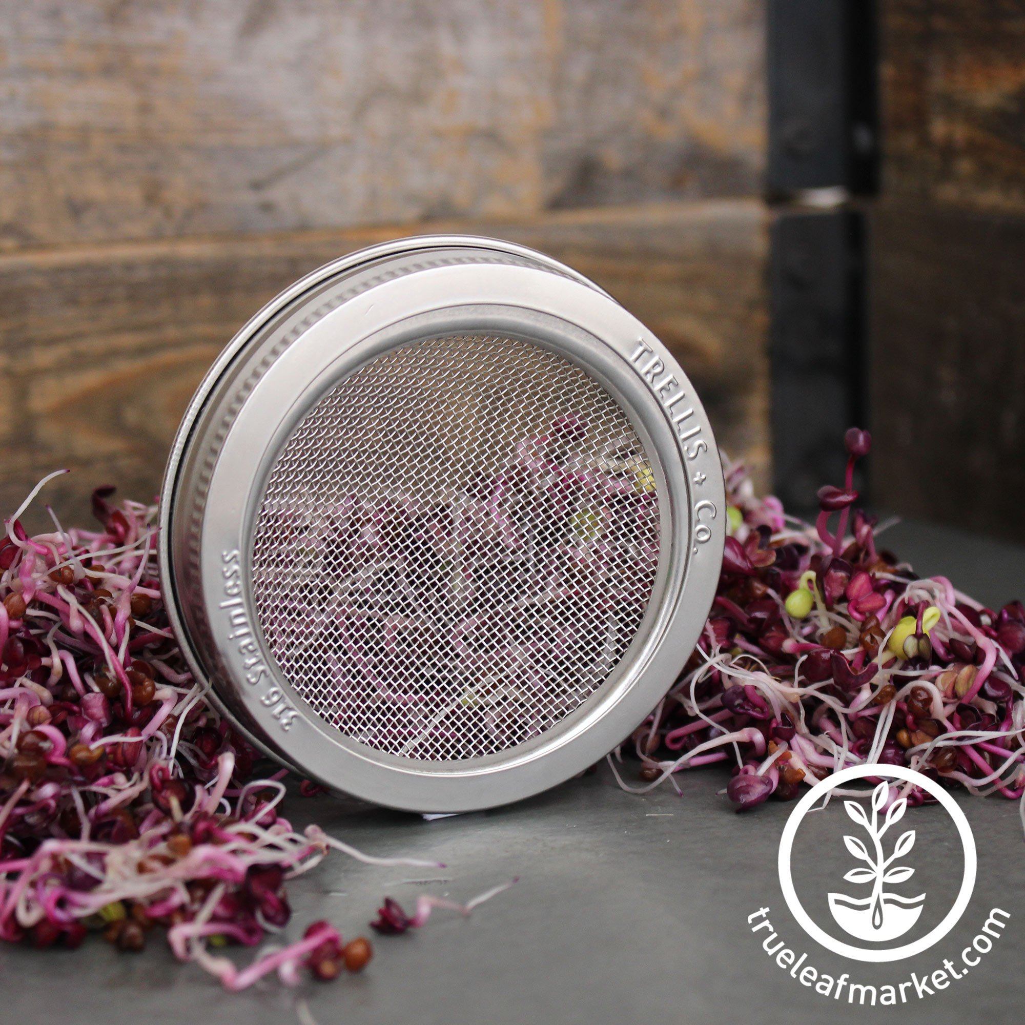 Premium 316 stainless steel sprouting jar lids with curved mesh form maximum ventilation. These dishwasher safe sprout lids fit almost any wide mouth mason style jar converting it into a kitchen countertop sprouter. The mesh is made of double thick stainless steel wire. Water flows through easily, while keeping in the smallest of sprouting seeds. Choose option with or without sprouting drain stands. Check out our free downloadable sprouting guide