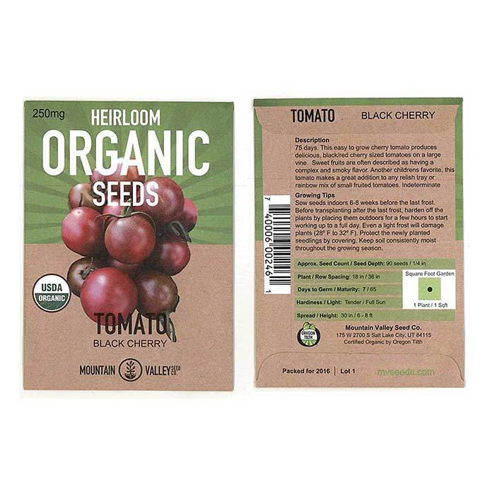 Black Cherry Tomato Seeds. Organic, Non-GMO.  75 days. This easy to grow cherry tomato produces delicious, black/red cherry sized tomatoes on a large vine. Sweet fruits are often described as having a complex, smoky flavor. Another childrens favorite, this cherry makes a great addition to and relish tray or rainbow mix of small fruited tomatoes.