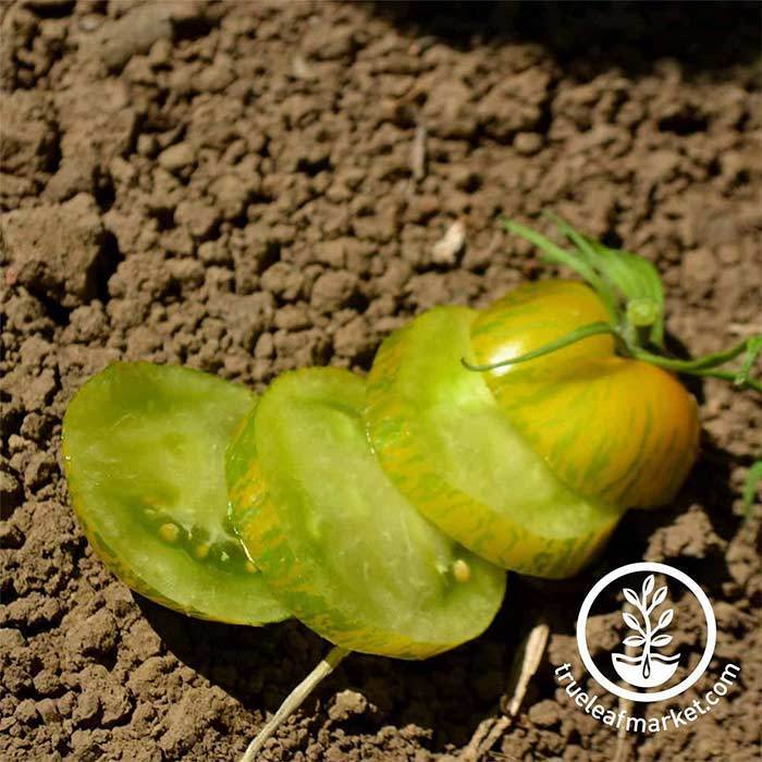 72 days. A small 2 inch round green tomato that matures into a golden yellow with dark-green stripes. The tangy flavor is a pleasant addition to salads, sandwiches, or salsas. Indeterminate.