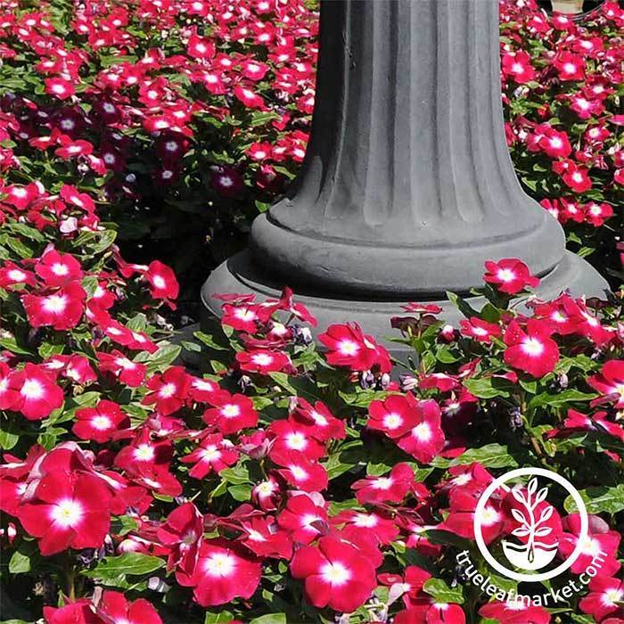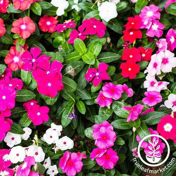 For earliest blooms, sow Pacifica XP vinca seeds indoors 8 – 10 weeks before final frost date. Pacifica XP vinca seeds can be slow to germinate and may require 10 – 21 days in complete darkness. Once germinated, move to sunny window spacing or fluorescent grow light until four true leaves have developed. Transplant vinca seedlings to decorative indoor container or pot and harden off if transplanting outside. Outside, plant Pacifica XP Series vinca seeds 1/8” deep and 6” apart in average, loamy, and well-drained soil with full sun. Unlike other vincas, Pacifica XP seeds are more tolerant of direct sunlight and do not require shade. Pacifica XP vincas are known for their hardiness in both hot, arid climates, yet still able to thrive in cool, wet conditions. Pacifica XP vinca seeds mature in 98 - 105 days as 10 – 12” tall compact mounds with a neat 6 – 8” spread sprinkled in radiant 2” blooms.
