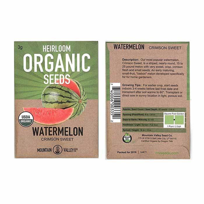 3g Package (3x4). 80-90 days. Non-GMO Organic Crimson Sweet Watermelon Seeds. Crimson Sweet Watermelon (Citrullus lanatus ) is a bold favorite among avid watermelon growers. A 15-20 lb. fruit with a very fine and sweet texture.