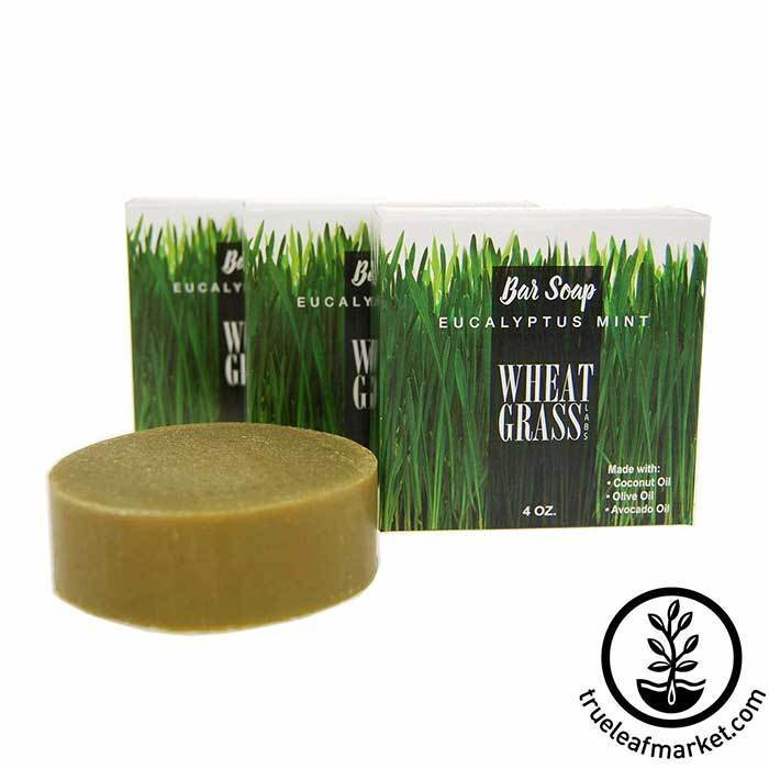 Wheatgrass is regarded as one of nature's most effective cleansers. Rich in chlorophyll, wheatgrass has antioxidant properties that provides the skin with protection against oxidative damage and environmental pollutants. Wheatgrass and Eucalyptus Mint Bar Soap is made with coconut oil, olive oil, and avocado oil. This product is plant based, gluten free, and never tested on animals!